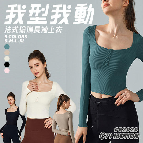 法式方領拼接緊身運動瑜珈短版長袖上衣(含胸墊)11/29(共6色) 【E53038】