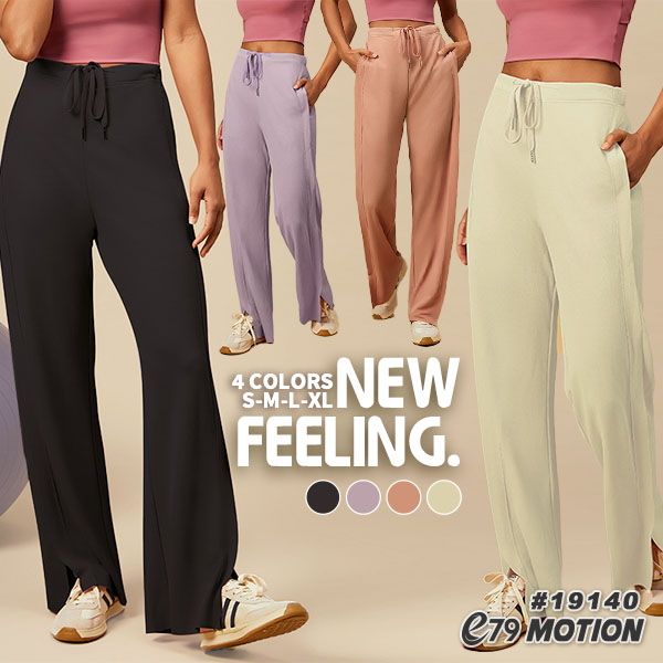 包容腿型高腰抽繩腰頭垂感寬鬆直筒闊腿開岔褲腳瑜珈長褲08/27(共4色) 【E19140】